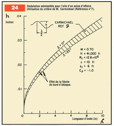 La figure 24 montre un exemple d’application de ce critère pour un avion d’affaires. On note l’évolution parabolique de l’amplitude d’ondulation avec la longueur d’onde et l’influence de la flèche. Cette relation est valable pour une ondulation disposée dans le sens des cordes de profil. Plusieurs ondulations successives nécessitent des coefficients correcteurs qui ne sont pas présentés dans cet article.