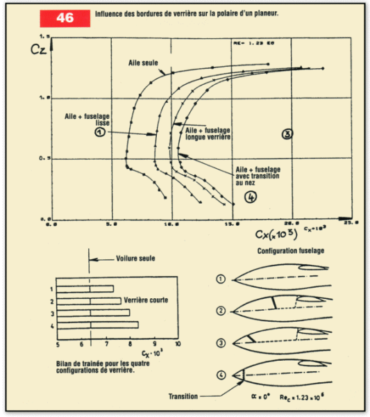 La figure 46 montre des résultats de soufflerie sur une maquette de planeur (fuselage + voilure partielle). Une bande rugueuse, simulant un désaffleurement de verrière de 0,75 mm à l’échelle 1, à été placée en différents endroits de la partie avant du fuselage. Les courbes montrent l’augmentation de traînée occasionnée par le supplément de frottement turbulent par rapport au fuselage lisse de base pour les différentes positions de bordure. Le Reynolds de vol est $1,2 . 10^6$, et la traînée de l’ensemble voilure-fuselage avec la verrière "longue" est 15% supérieure à celle de l’ensemble fuselage lisse.