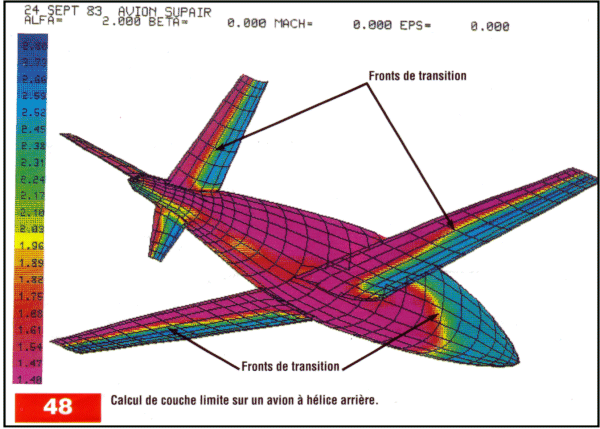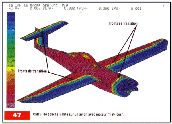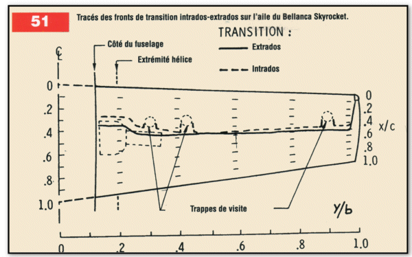 Sur la figure 51, les tracés des fronts intrados et extrados permettent de voir clairement l’effet de l’hélice (diminution de la surface laminaire à l’intérieur du sillage hélice), et le déclenchement de la transition pratiquement au droit des trappes de visite.