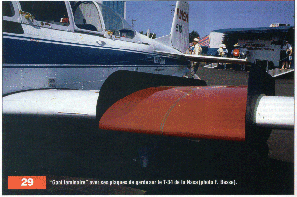 Des expérimentations récentes, en soufflerie et en vol sur deux avions différents (T-34C et Skyrocket), ont été effectuées par la Nasa (Réf. n’9) afin d’explorer ce domaine mal connu. Le T-34 "banc d’essai volant" est équipé d’un "gant laminaire" bordé de plaques de garde pour éviter la contamination turbulente du profil de base de l’avion. Un mini-gant laminaire est en plus installé tout contre le fuselage, dans le sillage d’hélice comme indiqué sur la figure 42.