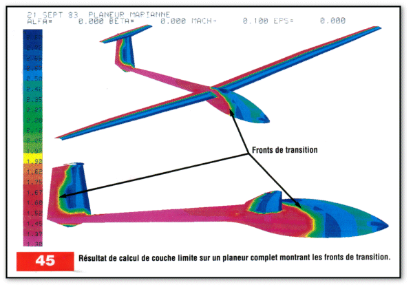 Les surfaces aérodynamiques des planeurs modernes présentent en général un fort potentiel de laminarité en comparaison des autres machines volantes. Un exemple de calcul tridimensionnel complet, avec couche limite, montre l’étendue de laminarité réalisable sur les plans porteurs et le fuselage du planeur biplace Marianne. La figure 45 montre ce résultat pour une incidence de 0°, et le nombre de Reynolds calculé sur la corde moyenne aérodynamique est de l’ordre de $2.10^6$ (Vinf = 105 km/h). Les" surfaces colorées" en vert-bleu indiquent les zones laminaires : paramètre de forme H supérieur ou égal à 2. Le calcul a été effectué avec une rugosité répartie égale à 20 microns. Si ce résultat est tout à fait envisageable pour les plans porteurs en pratique (peu ou pas de bouchons, de porte de visite, d’aspérités notables, joints, ... etc), il en est pas de même pour le fuselage ou inévitablement l’installation d’une verrière peut entraîner la formation de marches par désaffleurement des bordures.