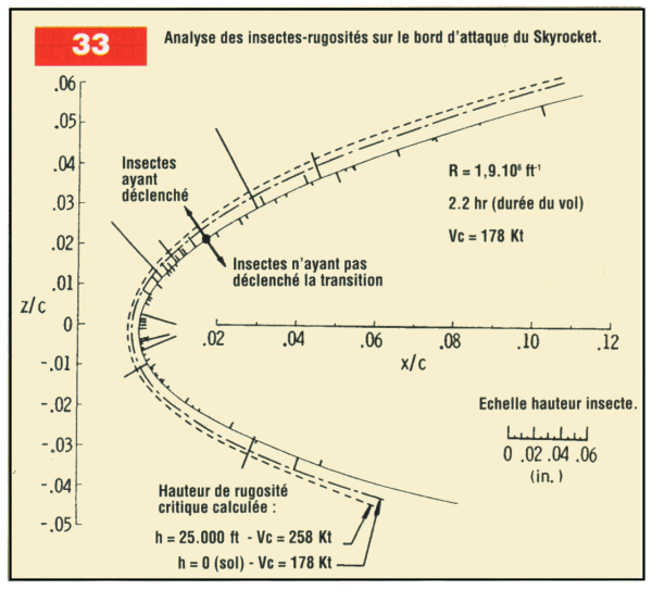 Deux courbes "enveloppe des hauteurs critiques de rugosité" ont été tracées sur le profil pour deux altitudes de vol (Z = 0 ft et Z = 25.000 ft). La hauteur critique admissible en altitude est plus grande, car elle correspond à un nombre de Reynolds plus petit, résultat déjà énoncé au début de ce paragraphe. A haute altitude, seulement six insectes (soit 9% du total) déclenchent la transition. Si après le décollage, on ne peut échapper à la collecte des rugosités (par passage dans les basses couches), la montée en niveau permettra de diminuer les déclenchements de transition et de diminuer la perte de performance difficile à évaluer dans ce cas. Pour un avion léger (aéro-club ou particulier), il est bien sûr envisageable de nettoyer les bords d’attaque des ailes dès le retour au sol. Si l’on admet qu’une contamination d’insectes peut dégrader sensiblement les performances d’un avion, la probabilité d’un niveau important de contamination reste malgré tout faible pour de nombreuses combinaisons de lieu, de période dans le jour, de mois dans l’année, du type de profil d’aile monté sur la voilure, et enfin du profil de la mission.