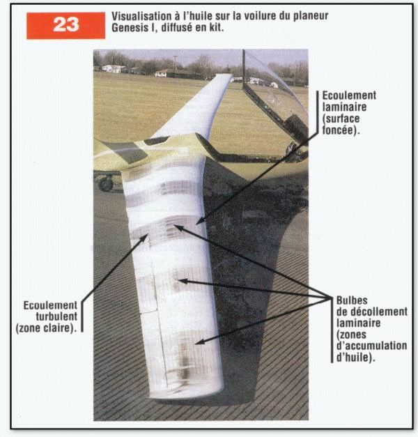 La deuxième méthode utilise une solution liquide composée d’huile et de pigments colorés pour visualiser la nature de l’écoulement. Cette technique est quelque peu différente de celle utilisant l’acénaphtène. L’huile pigmentée est appliquée au pinceau sur la surface à étudier. L’avion décolle et se positionne aux conditions d’essais choisies. Le film coloré par les pigments, film liquide cette fois, s’écoule dans le sens de l’écoulement selon sa viscosité et la température, mais beaucoup plus rapidement dans la zone turbulente où la contrainte de frottement pariétale - toujours elle - est la plus importante. La zone laminaire apparaît plus colorée (en plus foncé ou en plus clair suivant les pigments utilisés et la couleur du revêtement de l’avion) du fait de la plus grande épaisseur du film d’huile (Fig. 22). A la différence des visualisations à l’acénaphtène, cette technique permet de faire plusieurs conditions d’essais au cours d’un même vol si l’épaisseur du film d’huile au départ est suffisante. Par contre, il est nécessaire de disposer d’un avion accompagnateur ("chase airplane") pour réaliser des photographies ou des films vidéo des lignes de transition observées. Une photographie, prise au sol, montre le résultat d’une "visu" à l’huile sur la voilure du planeur américain Genesis 1. La zone laminaire apparait en plus foncée, tandis que la zone de transition est matérialisée par une petite zone en très foncé (bulbe de décollement laminaire : zone de recirculation et donc d’accumulation d’huile et de pigments augmentant le contraste sur la photo - Fig. 23).