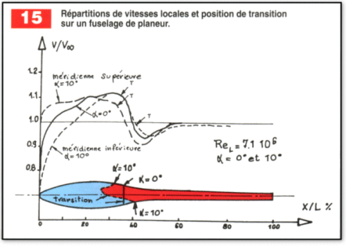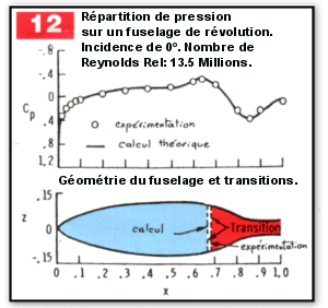 La figure 12 présente les résultats théoriques et expérimentaux obtenus sur un corps de révolution de rapport "longueur de fuselage sur diamètre du maître-couple " de l’ordre de 4,5 et pour une incidence de O°. L’état de surface correspond au " poli aérodynamique", et le nombre de Re calculé sur la longueur de fuselage total est de $13,4.10^6$. L’expérience et le calcul s’accordent bien pour prédire un emplacement de transition vers 68% de la longueur du corps, légèrement après la position du minimum de pression . Ce résultat, obtenu sur un fuselage quelque peu " académique" permet malgré tout d’apprécier l’étendue de laminarité qu’il est possible d’obtenir pour un nombre de Reynolds donné. L’exemple de la figure 13 représente un fuselage type avion d’affaires (Piaggio Avanti par exemple), et ce résultat est beaucoup plus transposable à un projet d’avion léger à propulsion arrière avec cabine intégrée. Le nombre de Reynolds est de $40,8.10^6$, ce chiffre correspond à un fuselage de 7 mètres de longueur se déplaçant à la vitesse de 74 m/s (265 km/h) à 0 m d’altitude. Les courbes de coefficient de pression, tracées sur les méridiennes inférieure et supérieure, permettent de se rendre compte que là aussi, les transitions apparaissent peu après la position du minimum de pression.