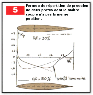 Cette façon de faire entraîne vite des limitations, on ne peut rechercher l’extension maximum de laminarité sans se préoccuper des conséquences induites sur le fonctionnement du profil. La figure 4 montre que plus on recule le maître-couple, plus la recompression (dKp/dX) est grande après le minimum de pression. Une comparaison, entre un profil symétrique ancien (NACA 0012) et un profil laminaire moderne, illustre bien l’influence de la position du maître-couple sur la forme de la répartition de vitesse (figure 5).