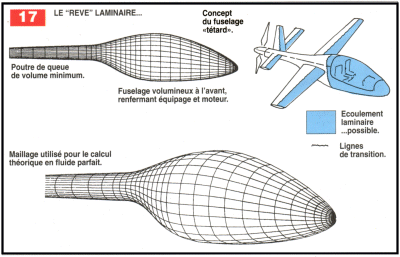 * Faisabilité d’un fuselage laminaire de type "têtard" pour l’avion léger : un concept proposé par différents concepteurs dans le passé, et qui vient peut être maintenant à l’idée du lecteur, est le suivant : dans le cadre d’un projet de monomoteur léger avec hélice arrière (fuselage avant "sans perturbations", pourquoi ne pas maximiser la surface mouillée baignée par la couche limite laminaire à faible coefficient de frottement, et minimiser celle à grand coefficient de frottement correspondant à l’écoulement turbulent ? Autrement dit, la partie de fuselage renfermant l’habitacle, éventuellement le compartiment moteur dans le cas d’une configuration avec arbre de transmission nécessitant le plus de volume dans un fuselage donné, serait le siège d’un écoulement à bas coefficient de frottement, tandis que la partie arrière supportant les empennages serait turbulente, mais avec une faible surface mouillée.