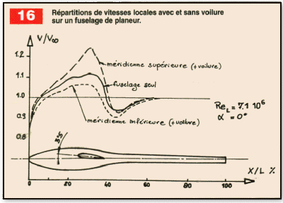 Une optimisation de la forme de ce fuselage a été effectuée en rajoutant de la cambrure à la ligne moyenne de fuselage dans la partie avant (ce qui redonne en plus de la visibilité à l’équipage). La figure 14 montre le résultat de cette modification sur la position du minimum de pression et l’augmentation de laminarité qui en découle. La figure 15 montre un effet d’incidence obtenu sur un corps de révolution ayant servi de base à une étude de fuselage de planeur à l’Université de Stuttgart (Réf. N°4). Le fait de rajouter une voilure (calée à 3°5 sur la référence fuselage) ne modifie pas sensiblement le gradient favorable de la méridienne inférieure, augmente de manière sensible l’accélération de l’écoulement sur la méridienne supérieure par rapport à la distribution de vitesse " fuselage seul", mais au prix d’une recompression plus forte de l’écoulement en arrière du bord de fuite de l’aile (figure 16).