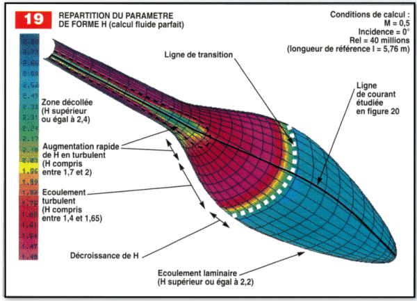 La distribution surfacique des coefficients de pression est présentée sur la figure 18. Celle, concernant le paramètre de forme H, permettant de reconnaître la nature de la couche limite, est tracée sur la figure 19. Le gain sur la puissance nécessaire, à vitesse donnée, pourrait laisser croire que le concept " marche bien ". Mais ce gain provient uniquement de la différence des coefficients de frottement laminaires et turbulents et il convient de s’intéresser à l’arrière du fuselage, où le calcul indique la présence d’un décollement turbulent.