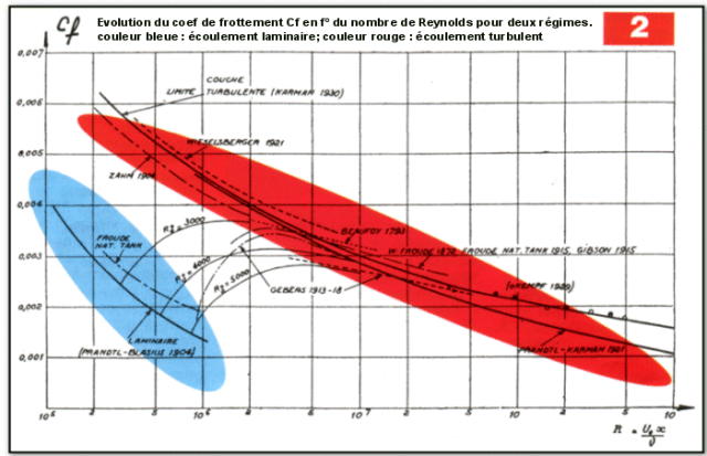Maintenant, chiffrons les valeurs des coefficients de frottement laminaires et turbulents : la figure 2 montre l’évolution du Cf en fonction du nombre de Reynolds (sans dimension) de l’écoulement $Re = Ve.L/n$, produit de la vitesse de référence de l’écoulement (dans notre cas ce sera la vitesse de vol de notre avion) par une longueur de référence (généralement la corde moyenne aérodynamique de l’aile), et divisé par la viscosité dynamique n de l’air.