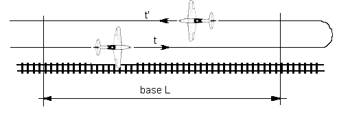 - Choisir au sol (sur une carte d’état major), 2 points le long d’une ligne droite (chemin de fer, route, canal) écartés de 5 à 20 km, dont la distance est connue à 1 ou 2% près, et qui formeront une base de longueur L.